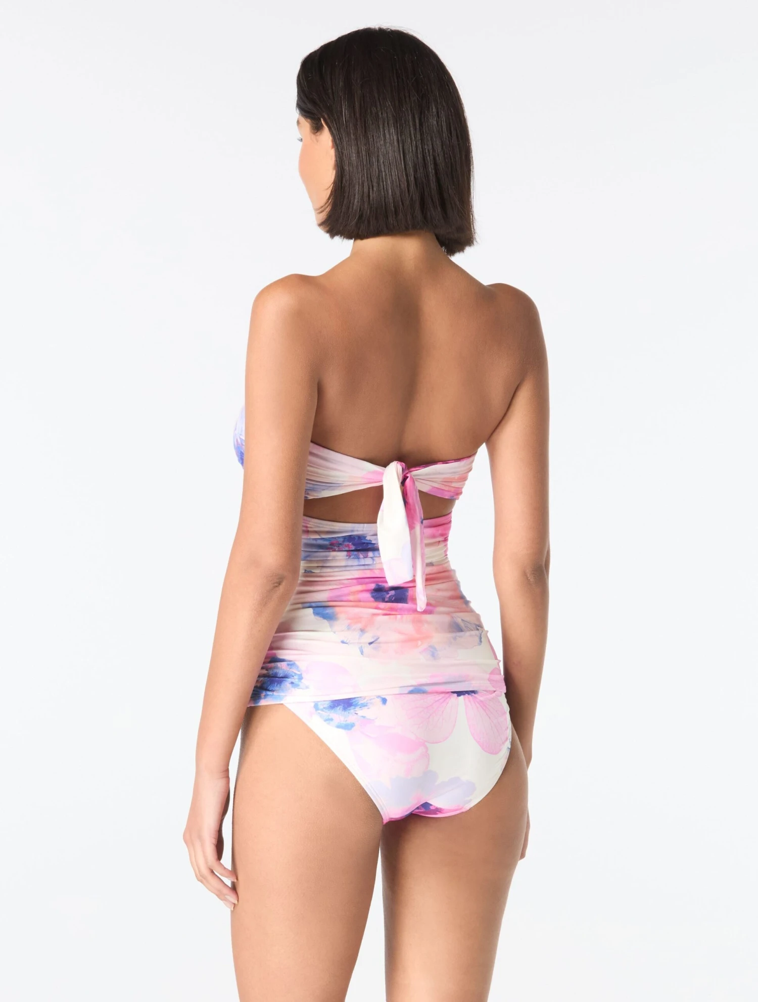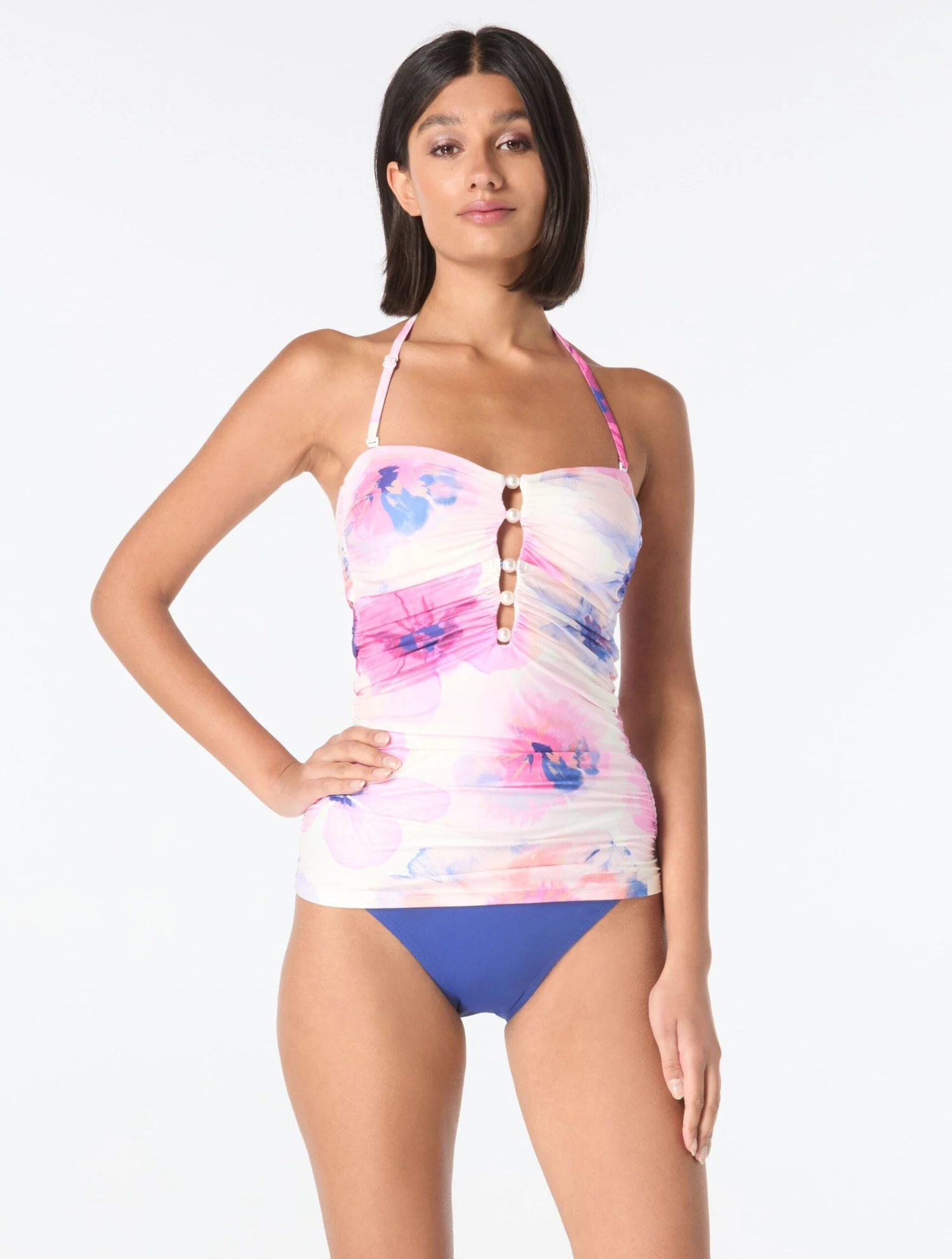 For the days you want more coverage than a bikini, this floral tankini is perfect. The bead trim front gives a luxurious and feminine splash. Pair this with a swim bottom for the beach or wide leg pants for a stroll through town.