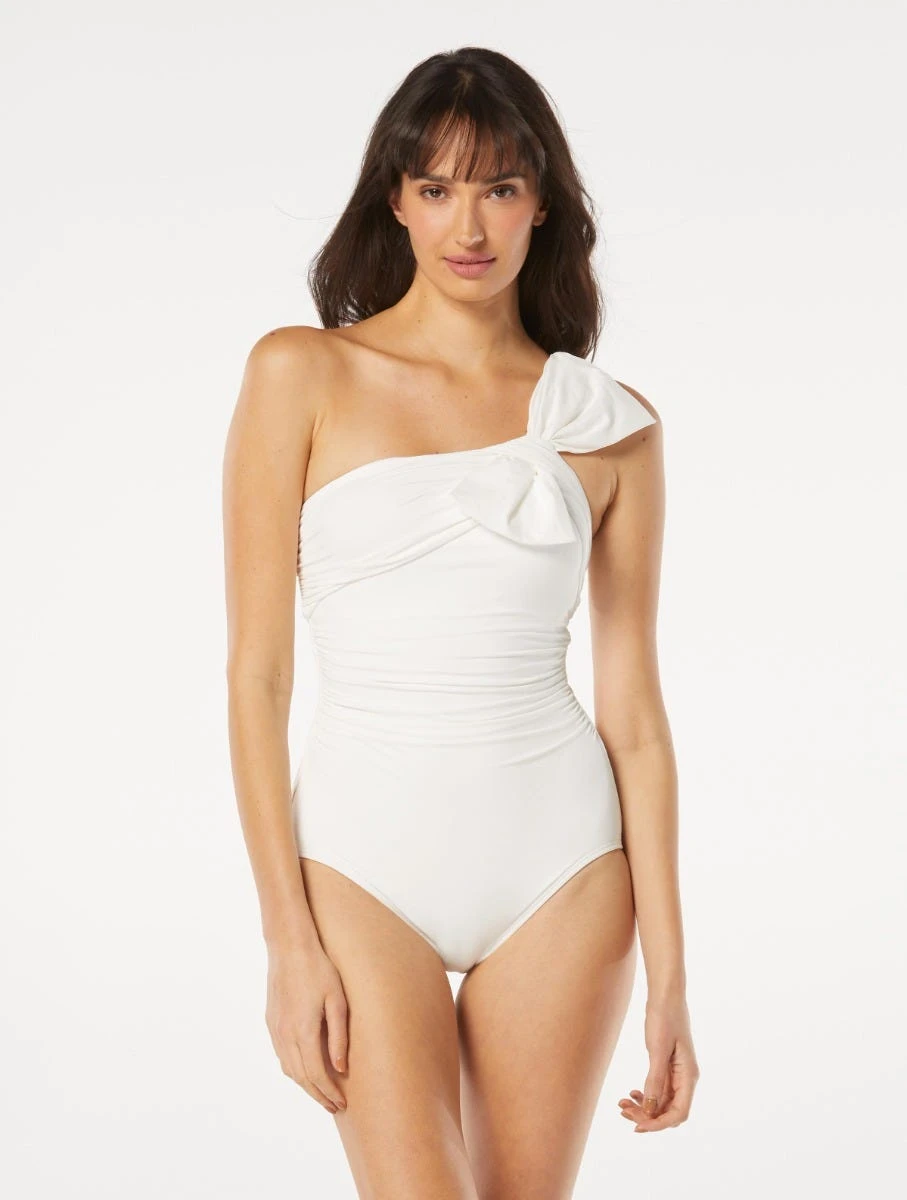 Inspired by Carmen Marc Valvo’s iconic gowns known for their bold bows, the Carmen Marc Valvo Ruched One Shoulder One Piece Swimsuit will have you feeling like a movie star on the beach. Featuring a bow shoulder, smooth shaping liner and ruching, get ready to feel glam and gorgeous.