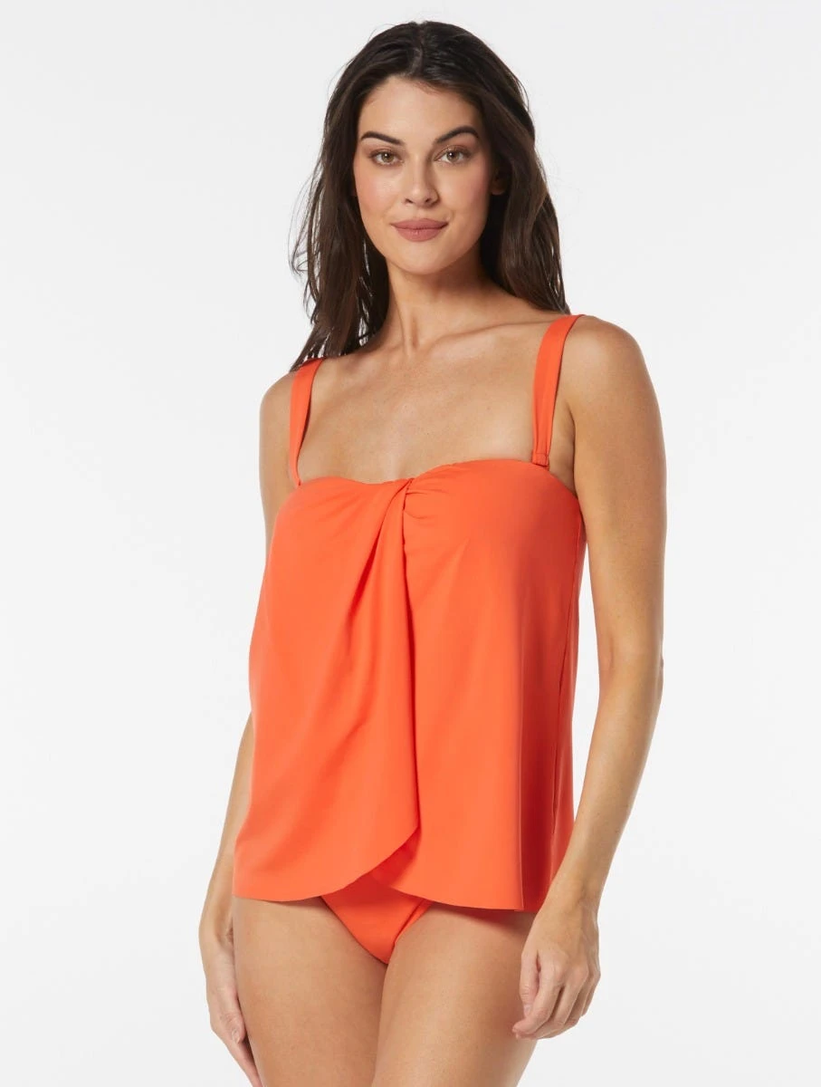 Coco Contours Clarity Bandeau Tankini Top with a flyaway hem features our innovative back-smoothing patented Shapemaker® Lining for a sleeker silhouette. The flowing petal hem is flattering and fashionable while molded cups offer additional support. A bold array of solid color options accent this bandeau tankini for luxurious, elegant swimwear.