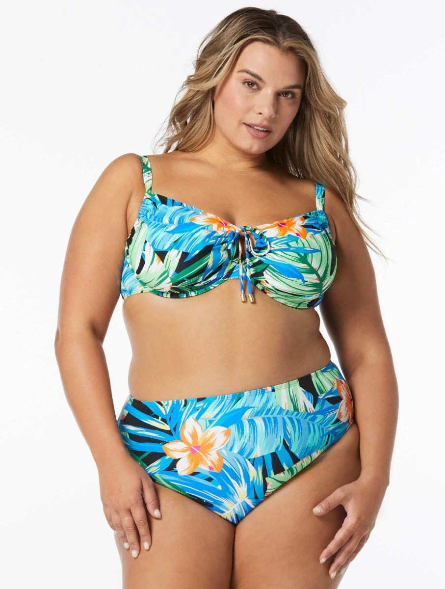 Fall in love with the Coco Reef Amour Bra Sized Underwire Bikini Top in a paradise inspired floral print. Featuring a full adjustable neckline for more or less coverage, removable soft cups, underwire, adjustable straps, decorative tie front, adjustable tie back and adjustable straps, it’s an eye catching silhouette.