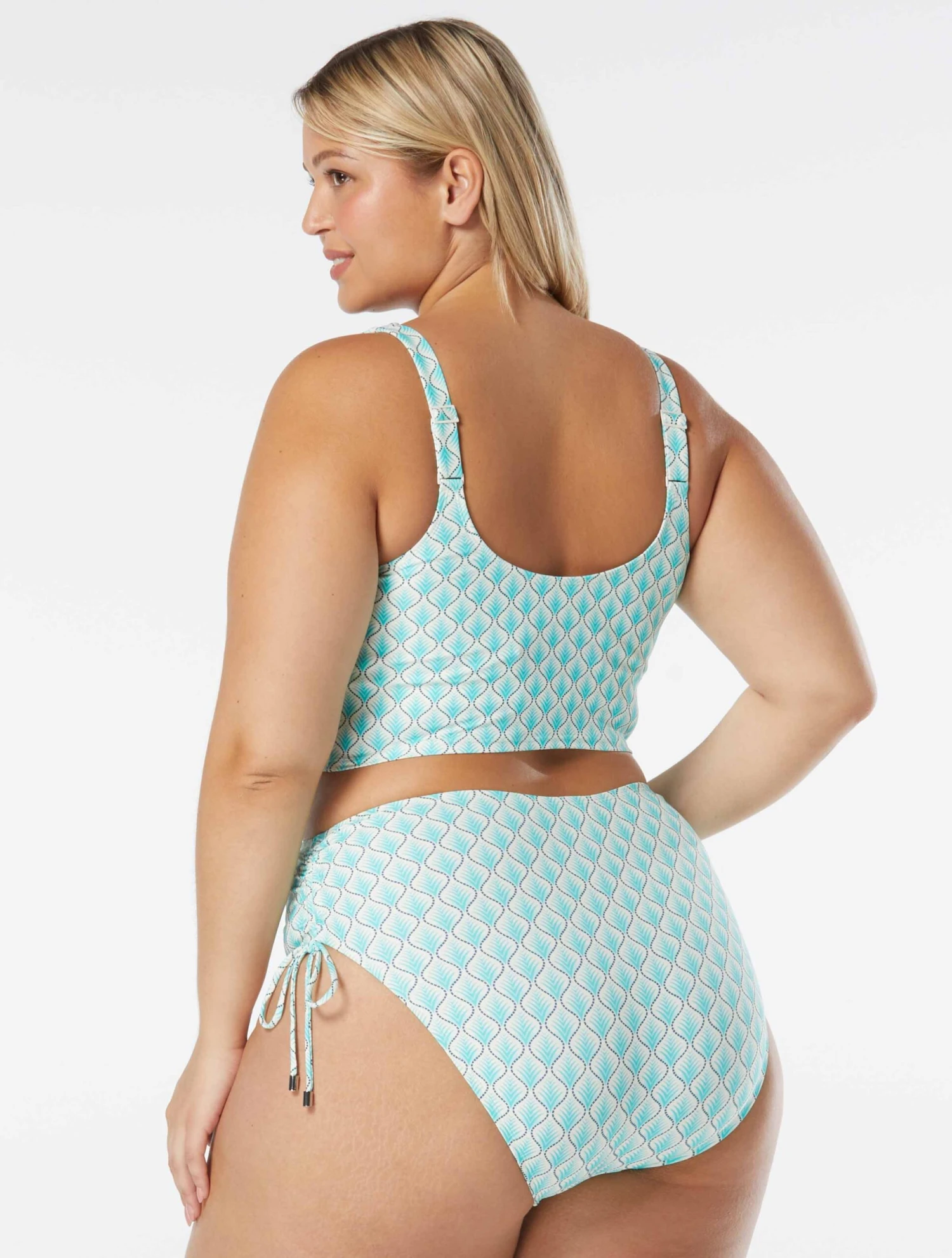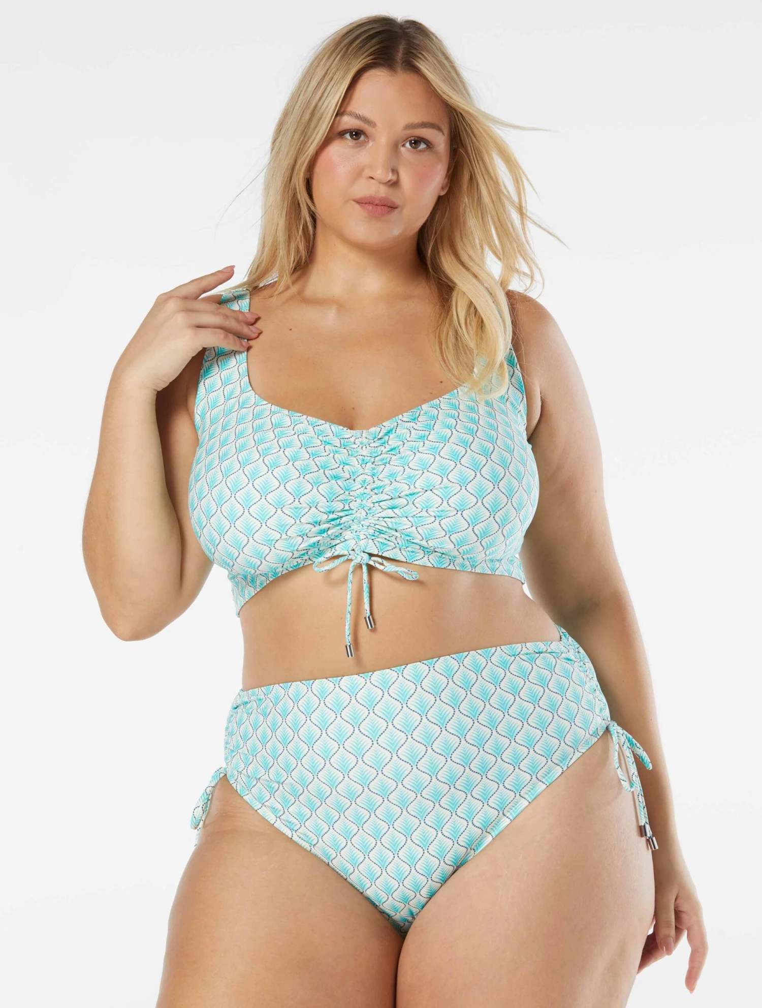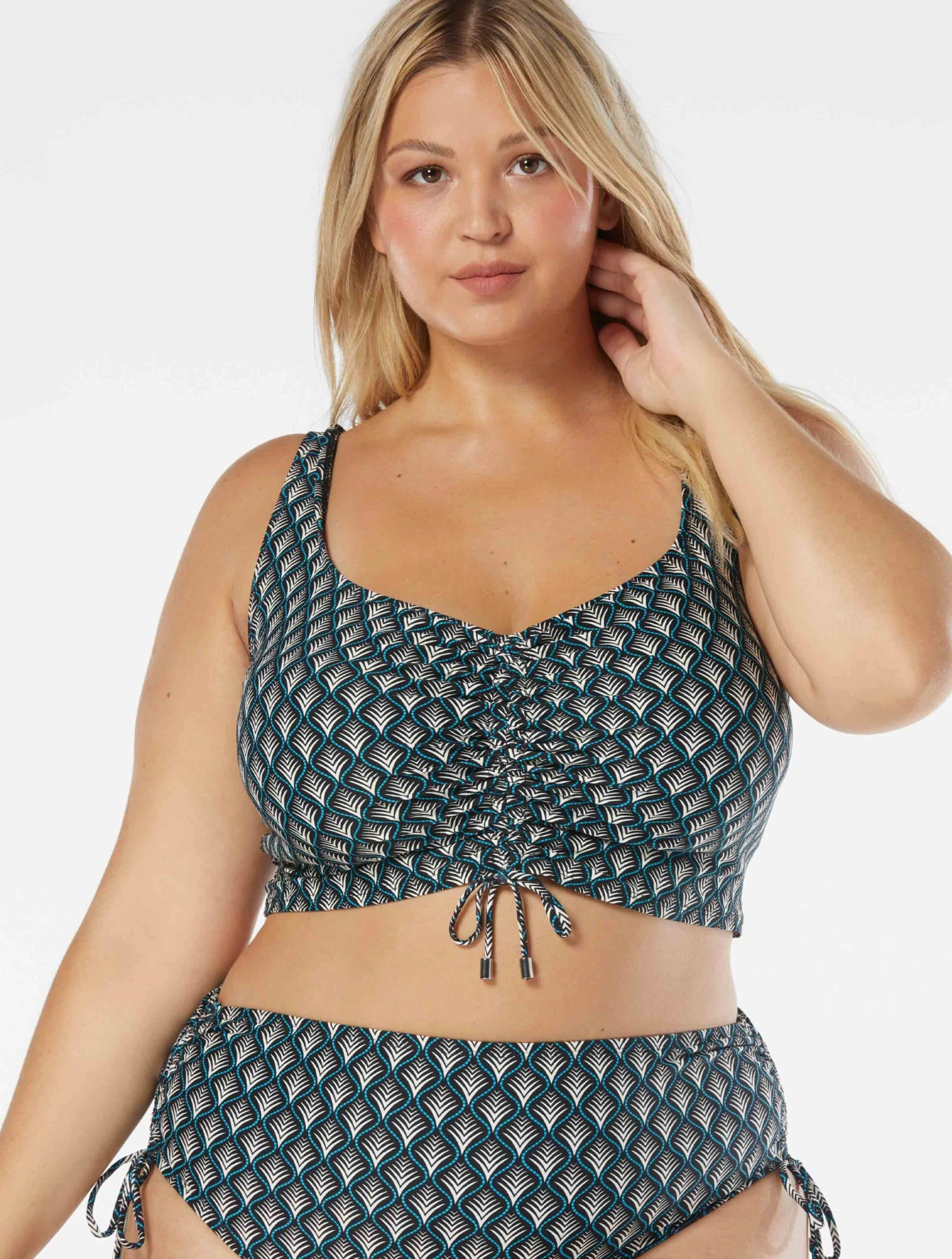 Elevate your swim style in Coco Reef’s Elevate Bra Sized Shirred Underwire Bikini Top featuring an abstract, oasis inspired print, shirred front, removable soft cups, underwire, silver trim details and adjustable drawstring front straps.Â