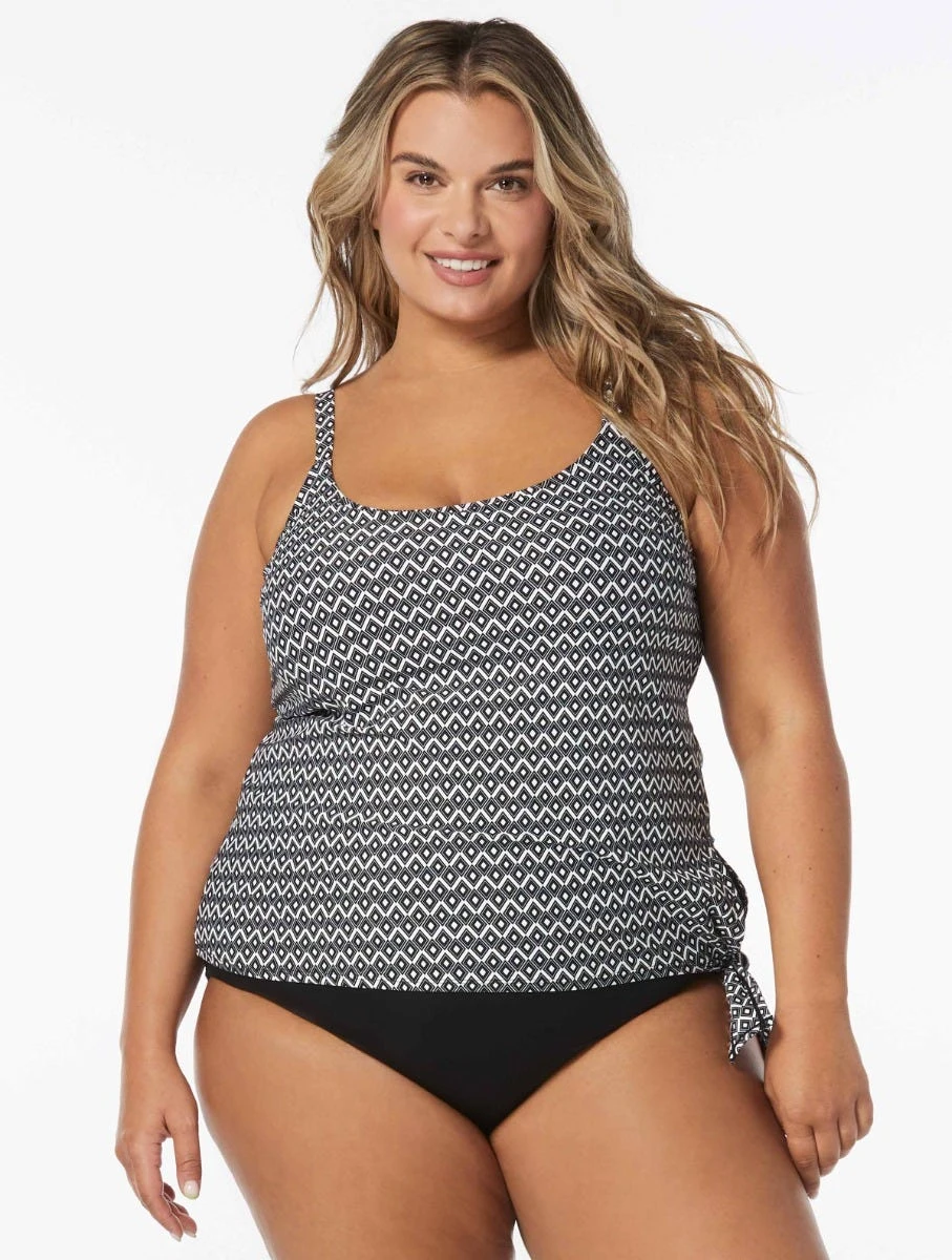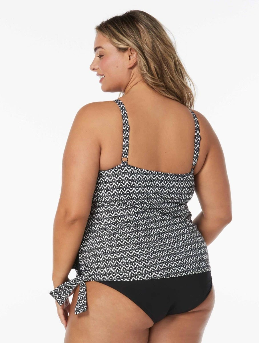 If you’re looking for a classic silhouette to feel confident and secure in your swimsuit, the Coco Reef Stella Tankini Top is the one to choose! The vintage tiki inspired black and white abstract print is trendy yet timeless while the side tie adds a fashionable flair.
