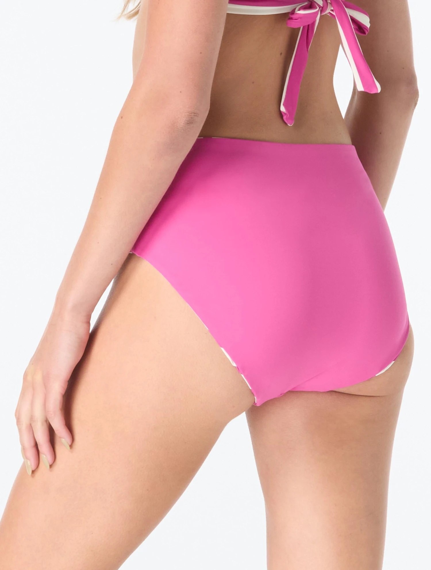 Reverse this bikini bottom to double the style in one curve-hugging silhouette. Choose your coverage with a high waisted option or roll it down to show more skin. Splashed with sorbet inspired stripes.