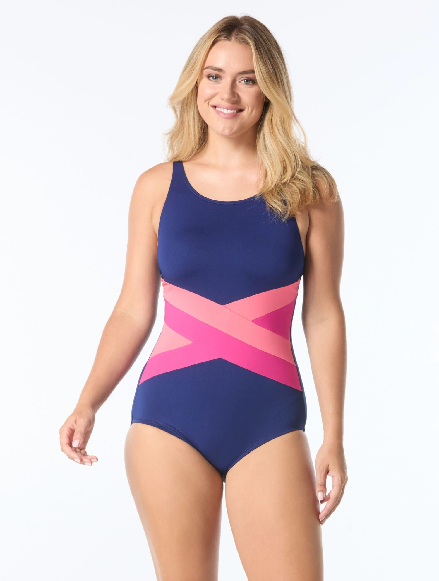 Look your best in the Gabar Chlorine Resistant High Neck One Piece Swimsuit featuring color blocking across the front. The flattering tummy control design gives you a confidence- boosting slimming look while the stay put leg and high neckline design keeps your bathing suit in place during all your activities. Our exclusive fully lined Hydrofinity swimsuit fabric is chlorine resistant for 300+ hours of use, breathable and provides UPF 50+ protection.