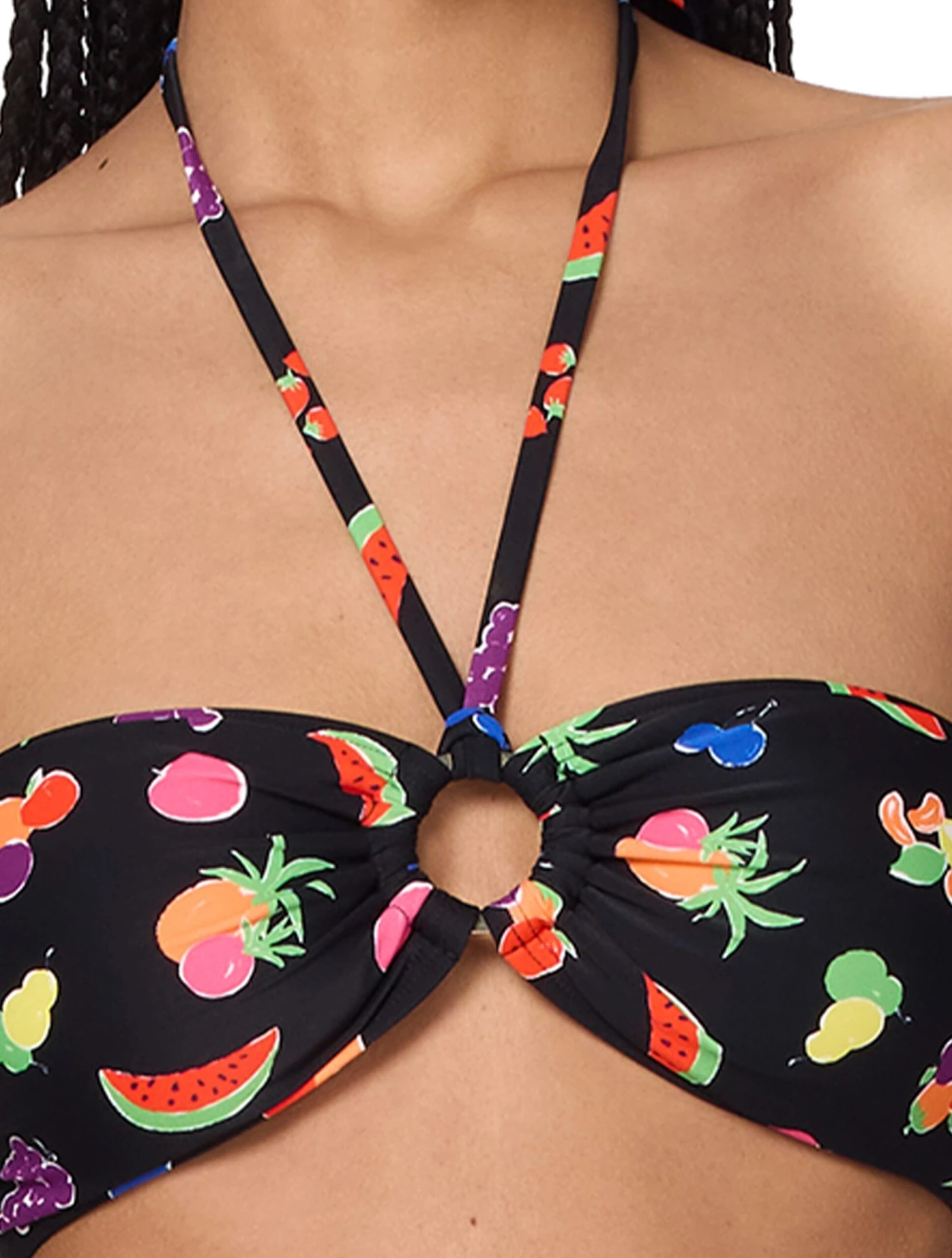 A no fuss, all fun, bandeau bikini top with ring trim neckline. Add some zest to your swim collection with an allover citrus chic fruit print.