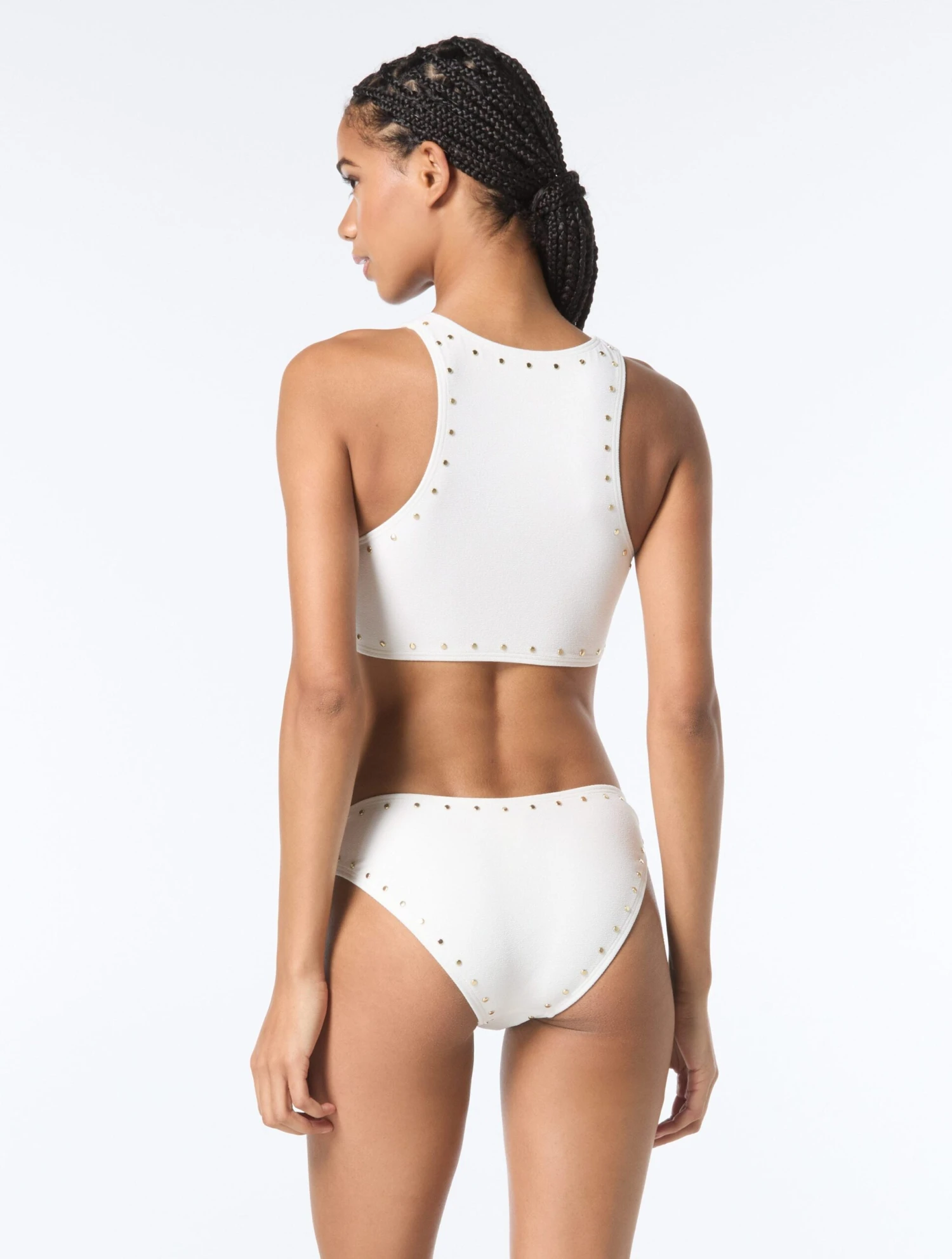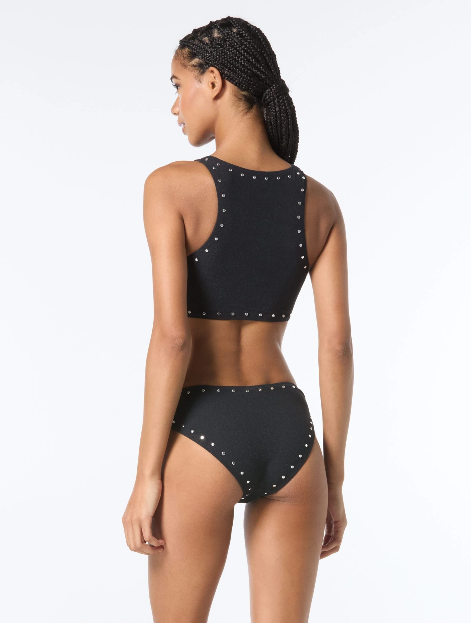 For a cool fit on hot days, grab this crop top. Timeless solids are made extra edgy with studded outlines and a ring front center. Wear it with a bikini bottom to the beach or high waisted shorts to the beach bar.