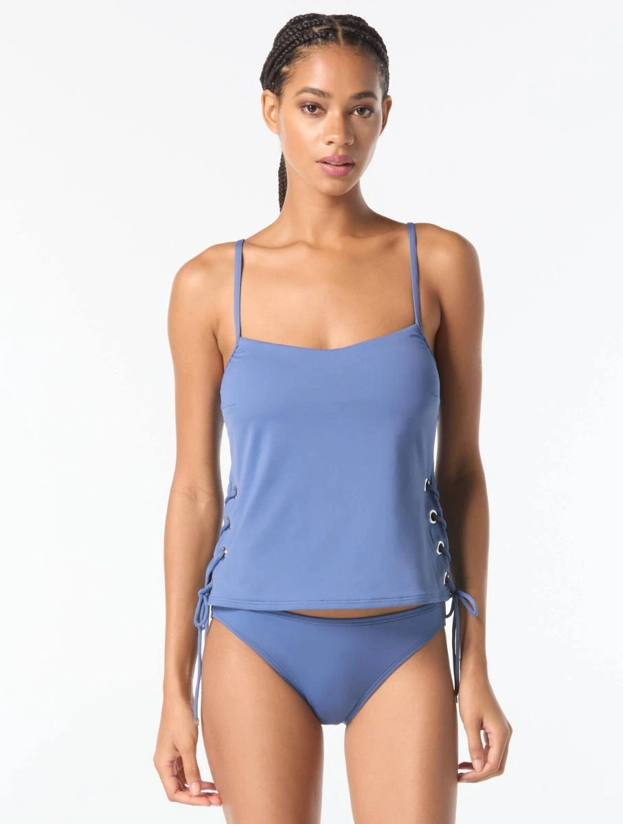A simple style gets an eye catching statement with lace up grommets on the side in the MICHAEL Michael Kors Grommet Tankini Top. This flattering silhouette is perfect for poolside days to vacations in paradise.