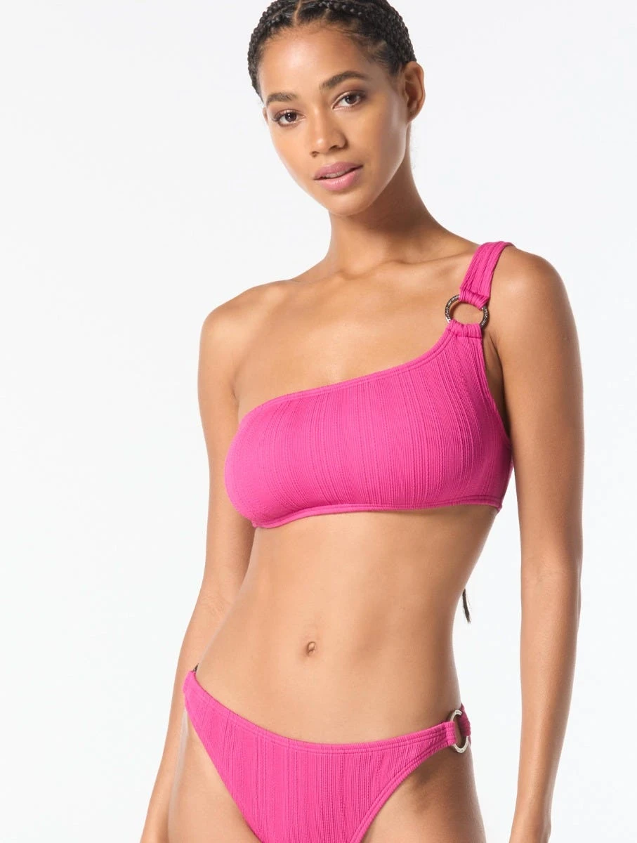 An asymmetrical neckline makes a statement with this bikini top. The one shoulder is accentuated with logo ring hardware. This cable knit ribbed fabric is ultra luxe and designed for in and out of the water.