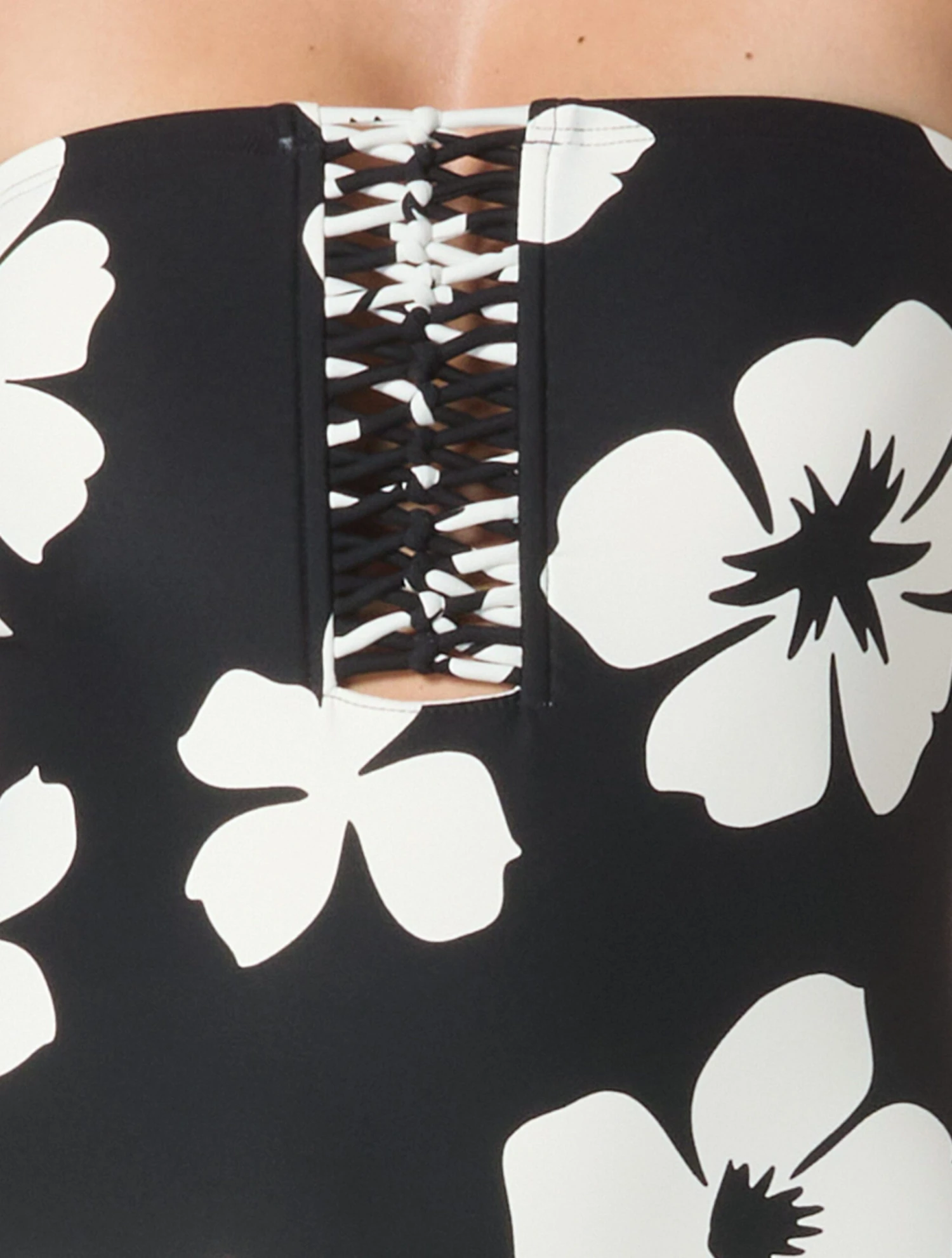 A comfortable one piece swimsuit with a seamless fit that won’t pinch or pull. The bandeau neckline is feminine and perfect for minimal tan lines. Add the strap for support. A macrame detail adds a cool factor to the neckline. Splashed with a modern botanical inspired floral print.